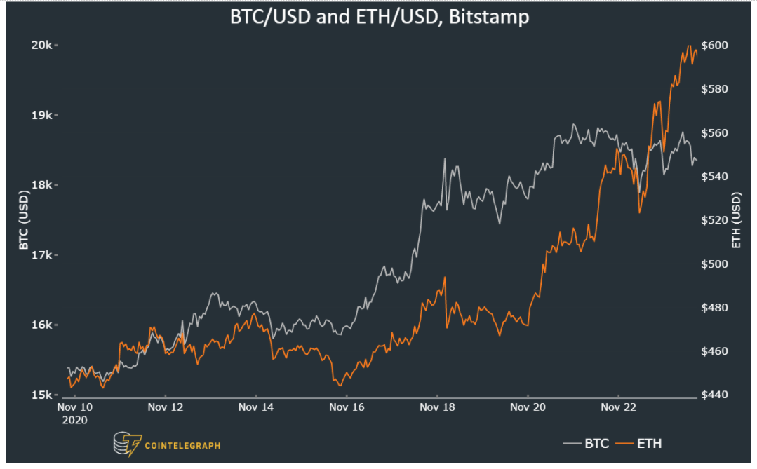 比特币上的BTC / USD和ETH / USD。来源:数字资产数据