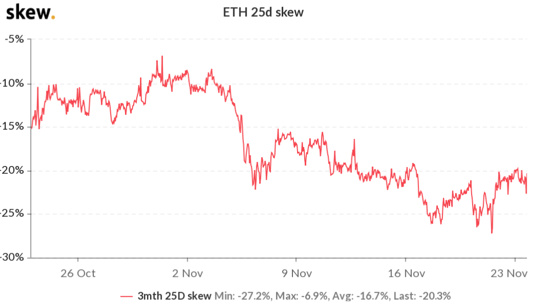 25%的偏差偏斜为正数表示,卖出(卖出)期权的价格比类似看涨(买入)期权的价格高,这表明看空情绪。另一方面,负偏斜表明看涨。