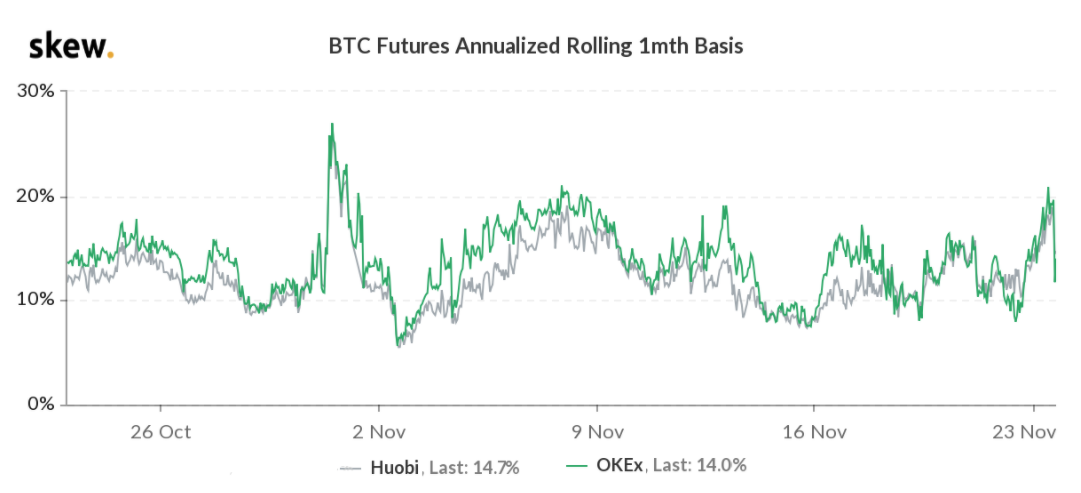 BTC 1个月期货合约溢价。资料来源:歪斜