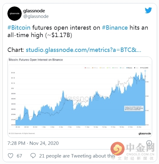 根据Glassnode提供的数据,Binance上的比特币期货未平仓合约也创下了11.7亿美元的历史新高。
