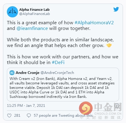 此前,Alpha Finance Labs发推文称,其Alpha Homora V2将于本月发布,Cream Finance、SushiSwap、Balancer、Curve将作为合作伙伴加入,以带动整个DeFi的增长。